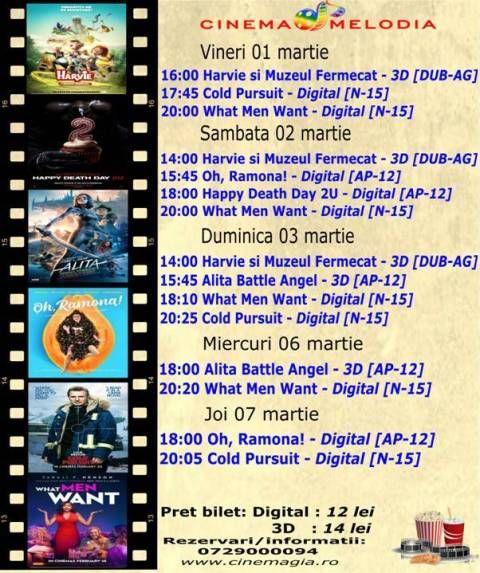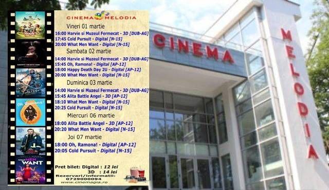 Filme de acţiune, animaţie, actiune dar şi thriller, este oferta cu care Cinematograful Melodia vine în această săptămână. Biletele pot fi rezervate la numărul de telefon: 0729.000.094.