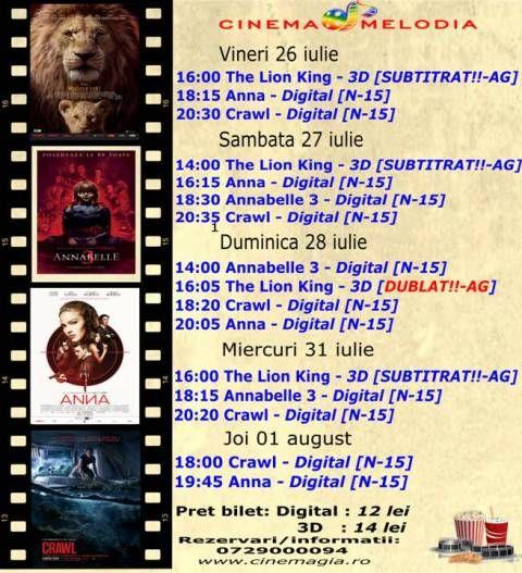 Filme de acţiune, animaţie, actiune dar şi thriller, este oferta cu care Cinematograful Melodia vine în această săptămână. Biletele pot fi rezervate la numărul de telefon: 0729000094 .