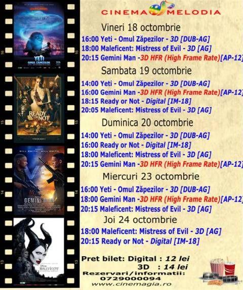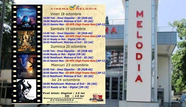 Filme de acţiune, animaţie, actiune dar şi thriller, este oferta cu care Cinematograful Melodia vine în această săptămână. Biletele pot fi rezervate la numărul de telefon: 0729000094 .
