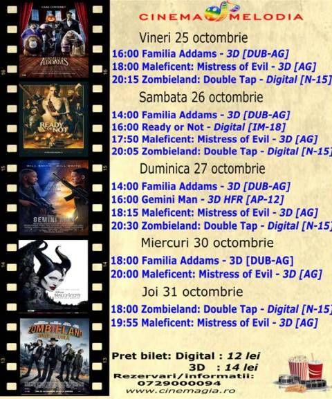 Filme de acţiune, animaţie, actiune dar şi thriller, este oferta cu care Cinematograful Melodia vine în această săptămână. Biletele pot fi rezervate la numărul de telefon: 0729000094 .