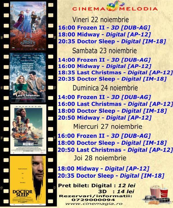 Filme de acţiune, animaţie, actiune dar şi thriller, este oferta cu care Cinematograful Melodia vine în această săptămână. Biletele pot fi rezervate la numărul de telefon: 0729000094 .