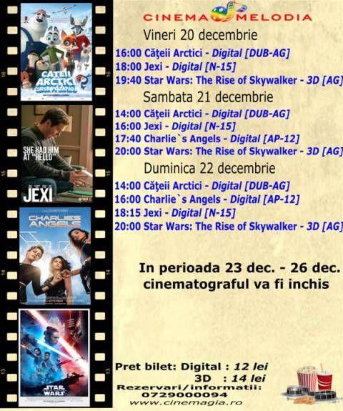 Filme de acţiune, animaţie, actiune dar şi thriller, este oferta cu care Cinematograful Melodia vine în această săptămână. Biletele pot fi rezervate la numărul de telefon: 0729000094 .
