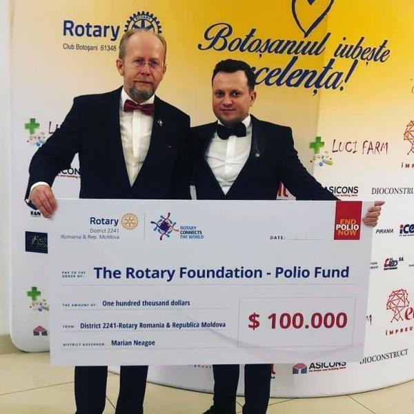 Fundația Bill & Melinda Gates s-a angajat să tripleze orice sumă cedată pentru eradicarea poliomielitei astfel încât cei 1.000 de dolari se vor înmulți foarte repede. Gestul antreprenorului botoșănean l-a mișcat și pe Marian Neagoe (foto stânga), Guvernator Rotary International al Districtului 2241 România și Republica Moldova: