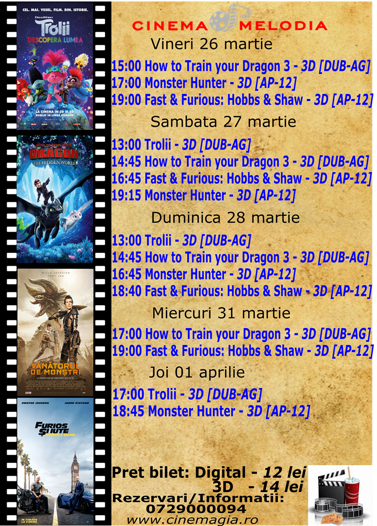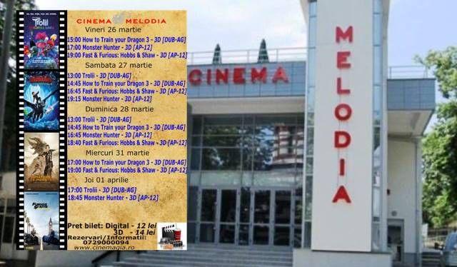 Filme de acţiune, animaţie, actiune dar şi thriller, este oferta cu care Cinematograful Melodia vine în această săptămână. Biletele pot fi rezervate la numărul de telefon: 0729000094.