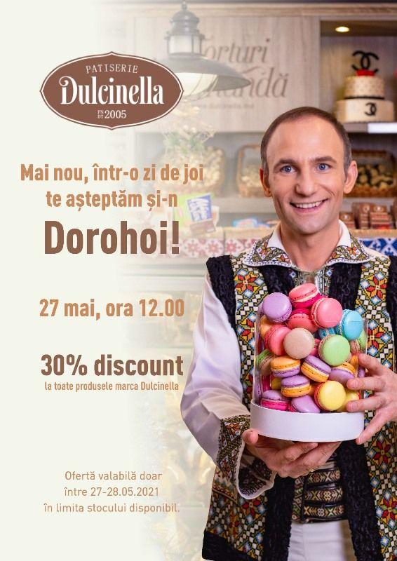 Vă așteptăm la deschiderea magazinului din „Dorohoi”, unde veți beneficia de reduceri de 30% la toată gama de produse „Dulcinella” în ziua deschiderii și a doua zi.