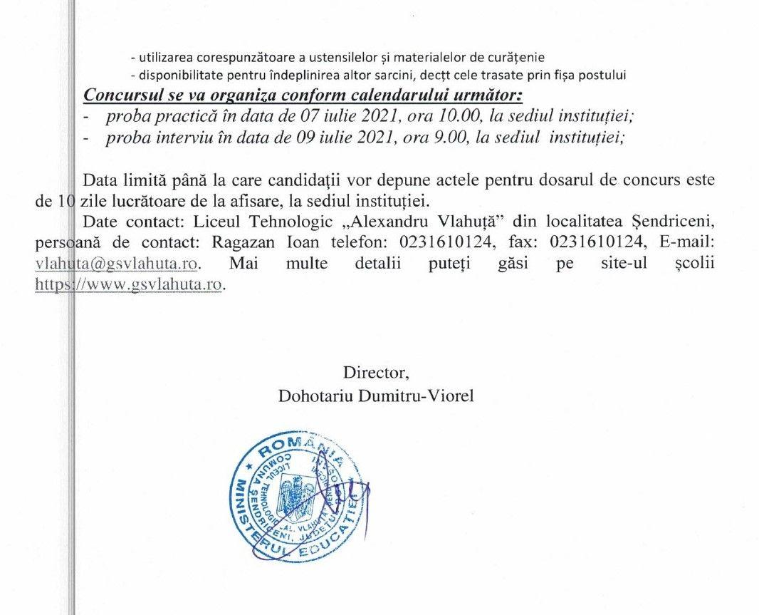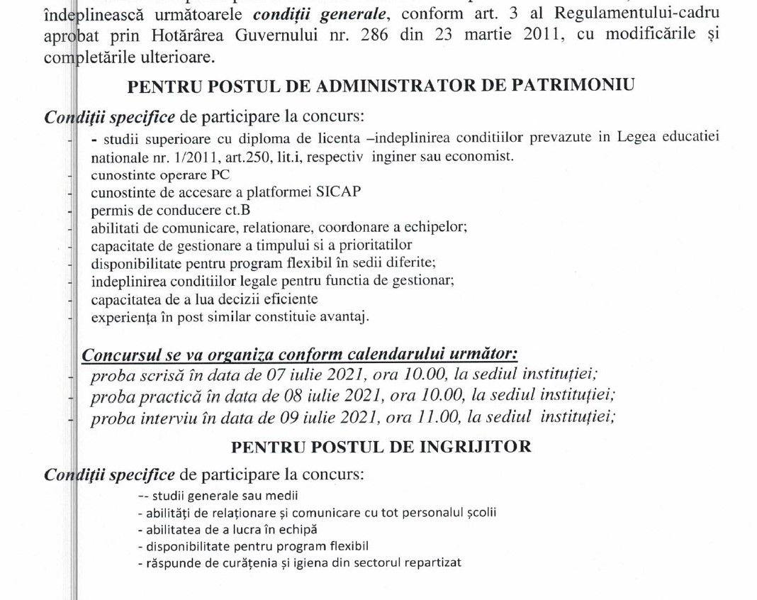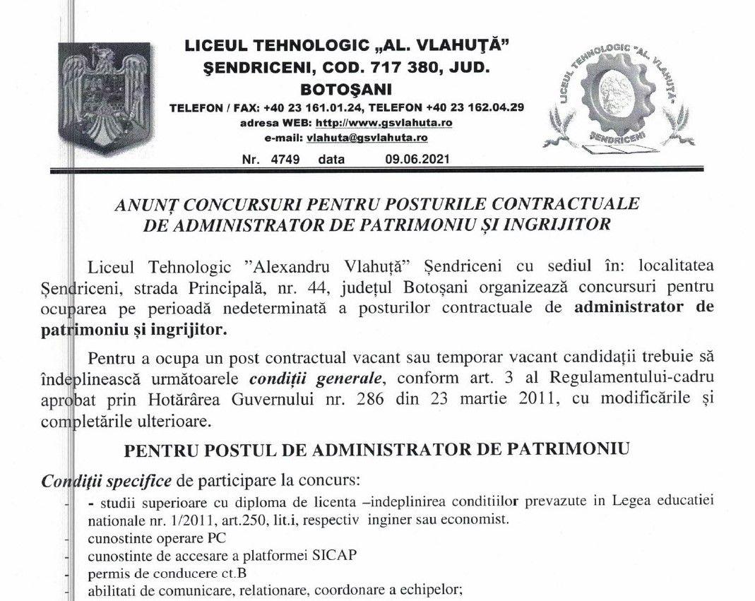 Liceul Tehnologic „Alexandru Vlahuță” Șendriceni cu sediul în: localitatea Șendriceni, strada Principală, nr. 44, județul Botoșani organizează concursuri pentru ocuparea pe perioadă nedeterminată a posturilor contractuale de administrator de patrimoniu și ingrijitor.