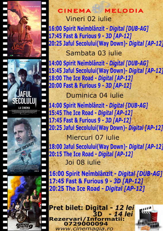 Filme de acţiune, animaţie, actiune dar şi thriller, este oferta cu care Cinematograful Melodia vine în această săptămână. Biletele pot fi rezervate la numărul de telefon: 0729000094.