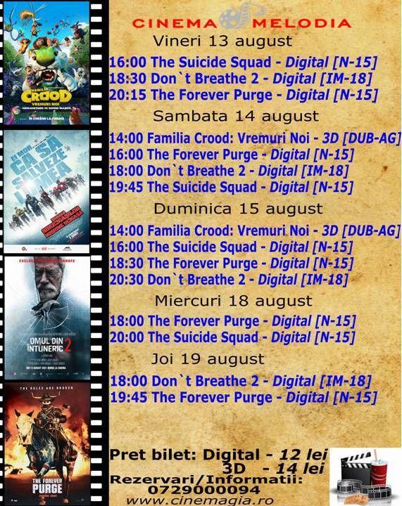 Filme de acţiune, animaţie, actiune dar şi thriller, este oferta cu care Cinematograful Melodia vine în această săptămână. Biletele pot fi rezervate la numărul de telefon: 0729000094.