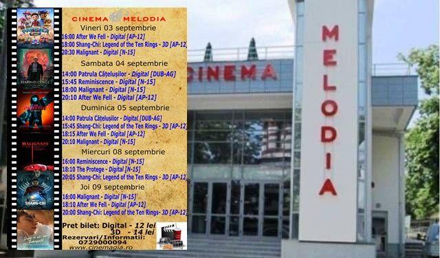 Filme de acţiune, animaţie, actiune dar şi thriller, este oferta cu care Cinematograful Melodia vine în această săptămână. Biletele pot fi rezervate la numărul de telefon: 0729000094.