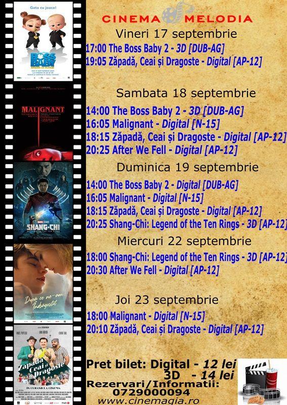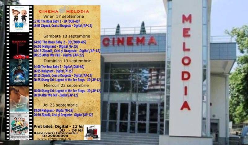 Filme de acţiune, animaţie, actiune dar şi thriller, este oferta cu care Cinematograful Melodia vine în această săptămână. Biletele pot fi rezervate la numărul de telefon: 0729000094.