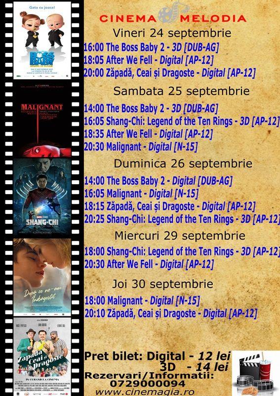 Filme de acţiune, animaţie, actiune dar şi thriller, este oferta cu care Cinematograful Melodia vine în această săptămână. Biletele pot fi rezervate la numărul de telefon: 0729000094.