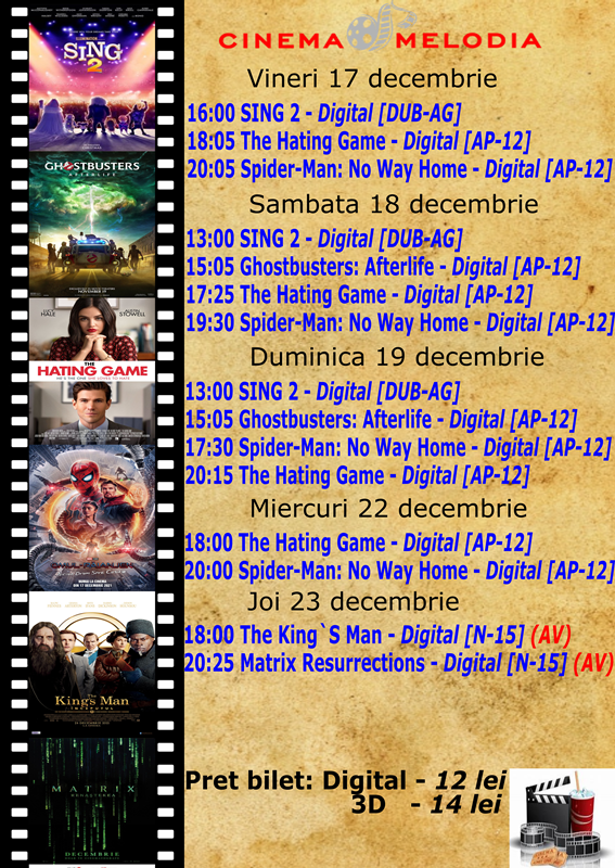 Filme de acţiune, animaţie, actiune dar şi thriller, este oferta cu care Cinematograful Melodia vine în această săptămână. Biletele pot fi rezervate la numărul de telefon: 0729000094.