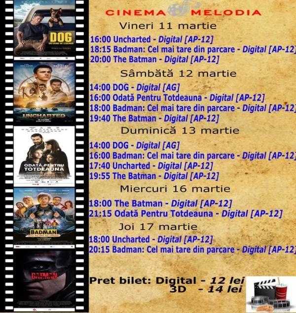 Filme de acţiune, animaţie, actiune dar şi thriller, este oferta cu care Cinematograful Melodia vine în această săptămână. Biletele pot fi rezervate la numărul de telefon: 0729000094.