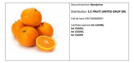 „Vă informăm ca am fost notificaţi de către furnizorul FRUTI UNITED GRUP SRL să iniţiem retragerea de la comercializare şi de la clienţi a articolului Mandarine. Motivul rechemării: depăşire a valorilor admise de reziduuri de pesticide CLORPIRIFOS”, a transmis, miercuri, Metro, potrivit unui anunţ pe site-ul oficial al ANSVSA.