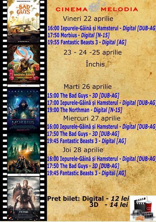 Filme de acţiune, animaţie, actiune dar şi thriller, este oferta cu care Cinematograful Melodia vine în această săptămână. Biletele pot fi rezervate la numărul de telefon: 0729000094.