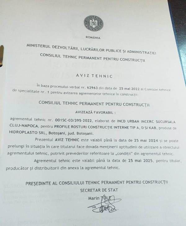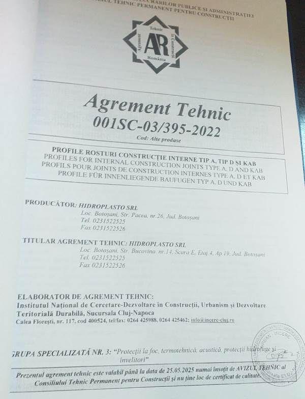 Compania Hidroplasto SRL a obținut agrementul tehnic pentru trei tipuri de profile pentru rosturi de construcție interne, acordat de Institutul Național de Cercetare și Dezvoltare în Construcții, o certificare a calității produselor fabricate în Botoșani după rețetă proprie.
