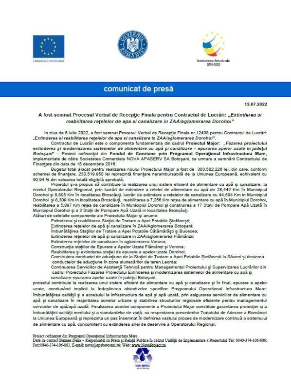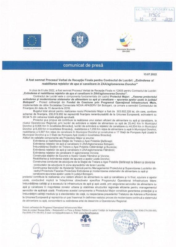 In ziua de 6 iulie 2022, a fost semnat Procesul Verbal de Recepţie Finala nr.12408 pentru Contractul de Lucrări: „Extinderea si reabilitarea reţelelor de apa si canalizare in ZAA/aglomerarea Dorohoi”.