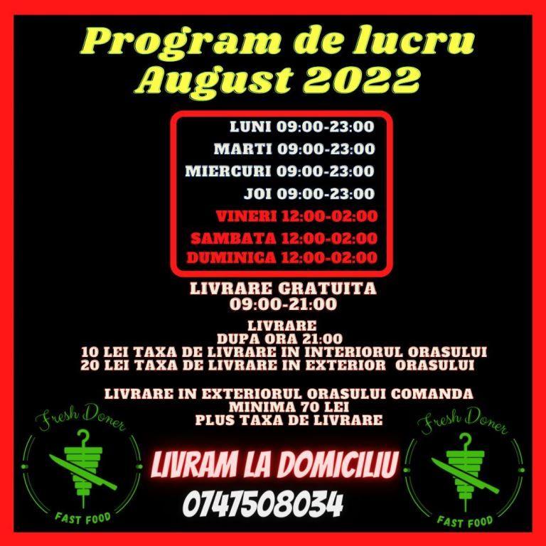 Fresh Doner Dorohoi își informează clienții despre faptul că, din data de 1 august 2022, programul de lucru se va schimba.