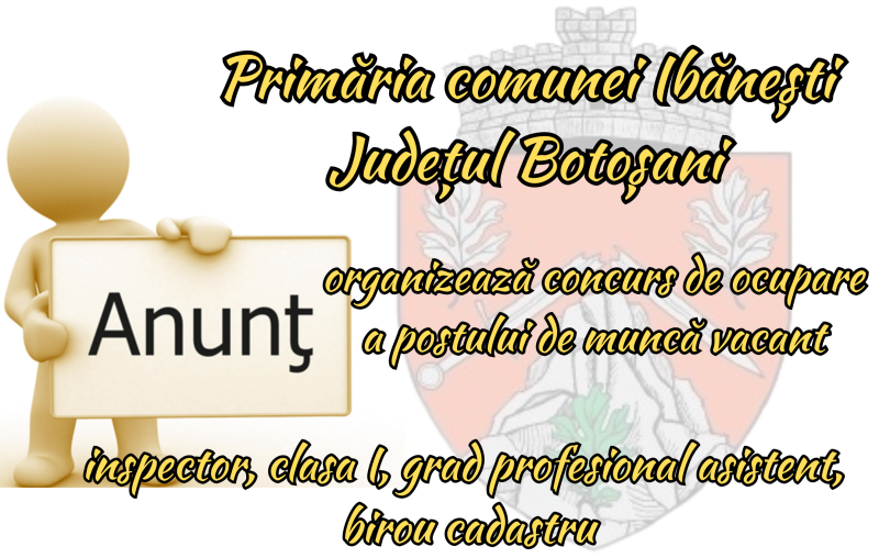 Primăria comunei Ibănești, județul Botoșani organizează în data de 19.06.2023, ora 10:00 concurs pentru ocuparea funcției publice de inspector, clasa I, grad profesional asistent, birou cadastru.