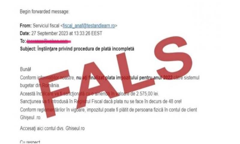 „Vă informăm că am fost înștiințați de către contribuabili că au primit mesaje false în numele ANAF, transmise de la adresa "Serviciul fiscal: [email protected]", prin care sunt avertizați că nu au finalizat plata impozitului pentru anul 2022 și că „vor fi sancționați cu amenda de 2.575 lei, dacă nu efectuează plata în decurs de 48 de ore!”