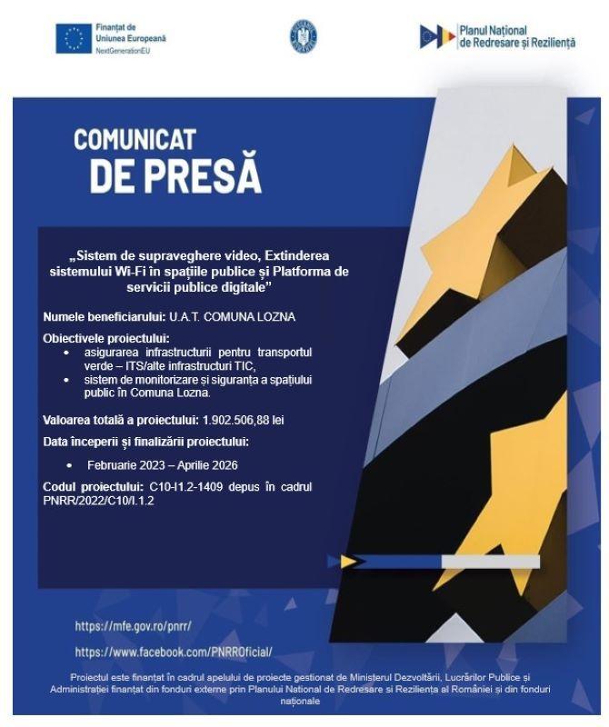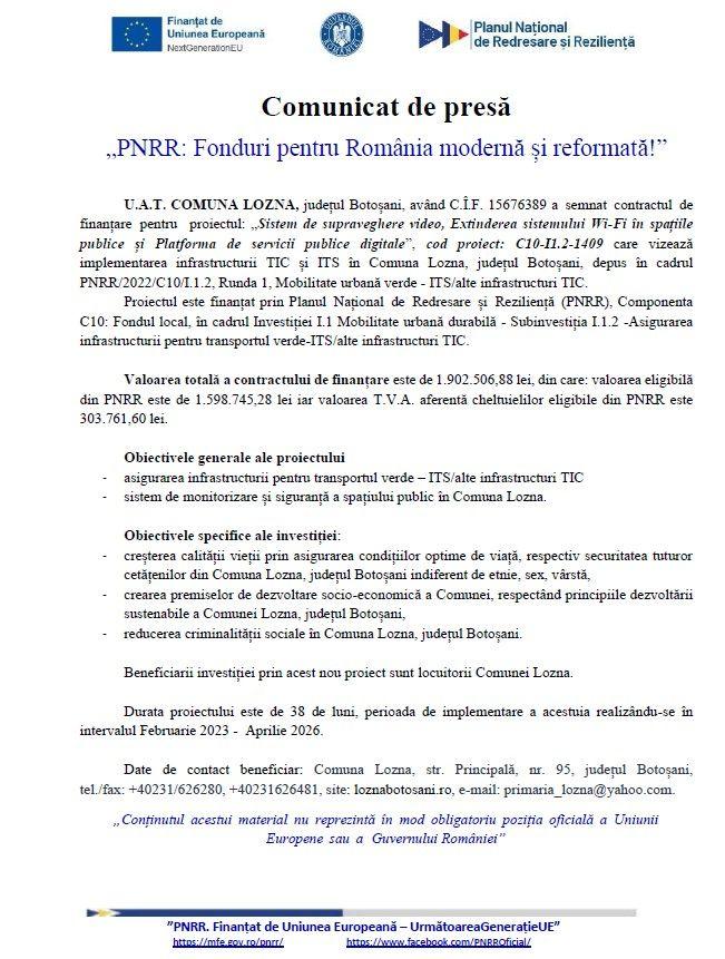 UAT COMUNA LOZNA a semnat contractul de finanțare pentru infrastructurii TIC și ITS în Comuna Lozna, județul Botoșani, cod proiect C10-I1.2-1409, depus în cadrul PNRR/2022/C10/I.1.2, Runda 1, Mobilitate urbana verde - ITS/alte infrastructuri TIC.