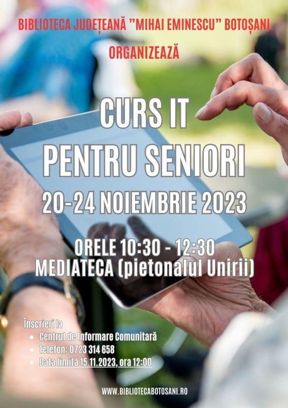 Biblioteca Județeană "Mihai Eminescu" Botoșani invită persoanele interesate, în perioada 20-24 noiembrie 2023, la o nouă serie de Cursuri de IT pentru Seniori.