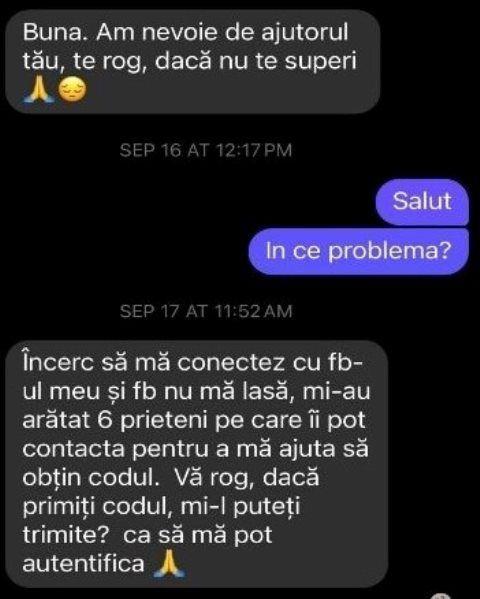 Utilizatorii Facebook pot primi mesaje de la cunoscuți sau prieteni, în care li se cere ajutorul pentru obținerea unui cod de autentificare. Dar utilizatorul mai trebuie să introducă, de asemenea, un cod de autentificare valabil pentru câteva secunde. Acesta se transmite fie prin sms, fie prin mail, sau este generat prin intermediul unei aplicații, disponibilă de regulă pe dispozitiv (ex: Google Authenticator, Microsoft Authenticator). Acest cod este util în cazurile în care am folosit aceeași parolă pentru mai multe conturi.