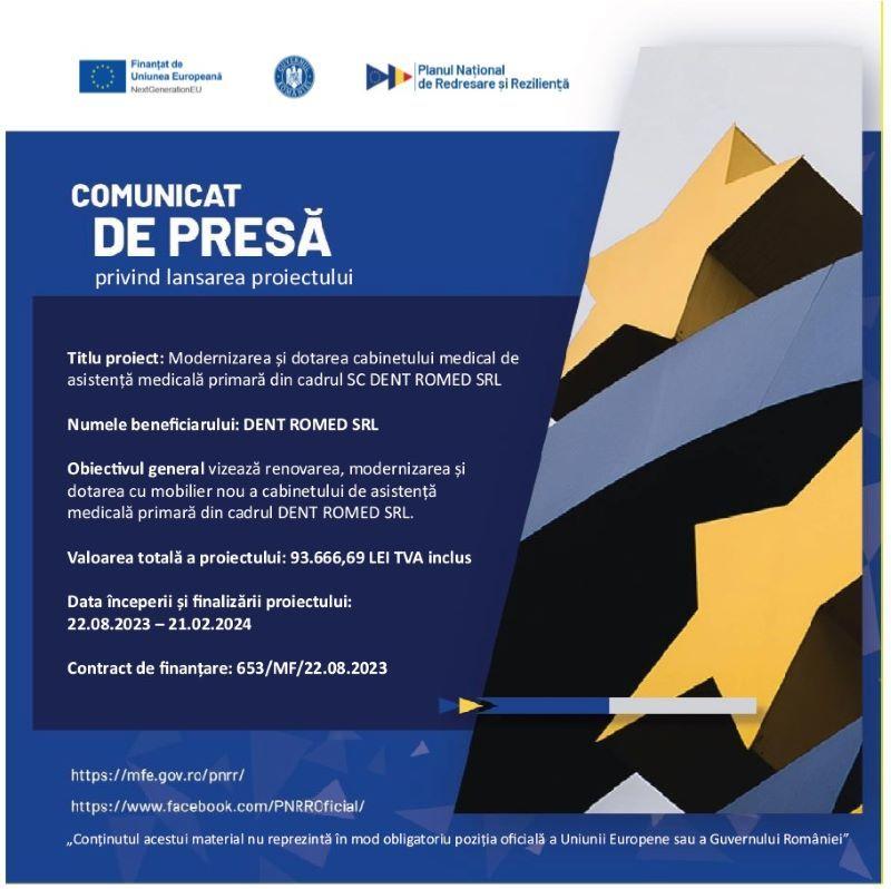 DENTROMED SRL, anunta demararea proiectului „Modernizarea și dotarea cabinetului medical de asistență medicală primară din cadrul SC DENT ROMED SRL”, proiect finantat de Uniunea Europeana – Urmatoarea Generatie UE, in cadrul Planului Național de Reziliență și Redresare, Pilonul V: Sănătate și reziliență instituțională, COMPONENTA: 12 - Sănătate, INVESTIȚIA: 1. Dezvoltarea infrastructurii medicale prespitalicești, Investiția specifică: I1.1: Cabinete ale medicilor de familie sau asocieri de cabinete de asistență medicală primară, COD APEL MS-0001.