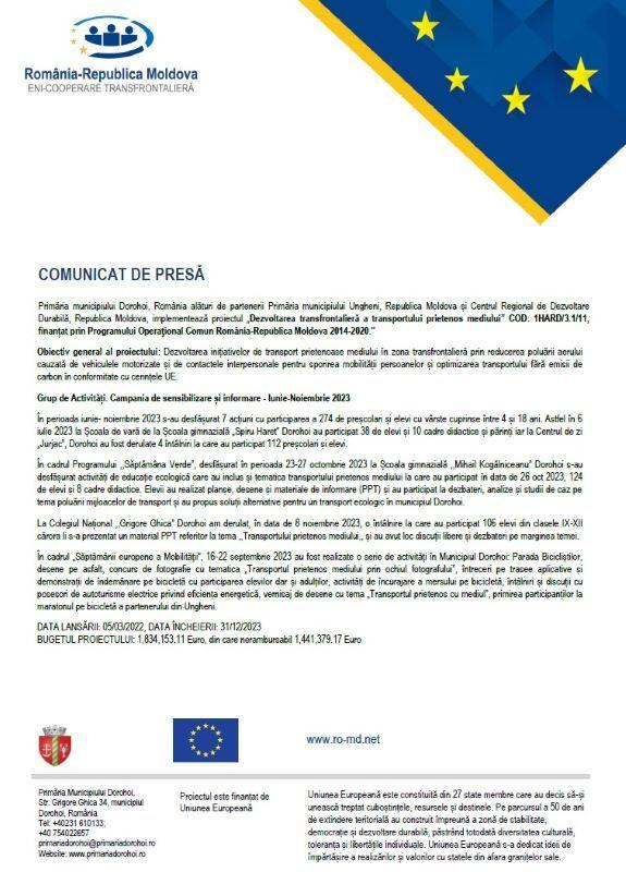 Primăria municipiului Dorohoi, România alături de partenerii Primăria municipiului Ungheni, Republica Moldova și Centrul Regional de Dezvoltare Durabilă, Republica Moldova, implementează proiectul „Dezvoltarea transfrontalieră a transportului prietenos mediului” COD: 1HARD/3.1/11, finanțat prin Programului Operaţional Comun România-Republica Moldova 2014-2020.”