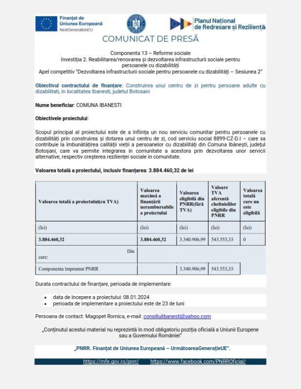 Obiectivul contractului de finanțare: Construirea unui centru de zi pentru persoane adulte cu dizabilitati, in localitatea Ibanesti, judetul Botosani