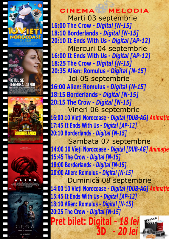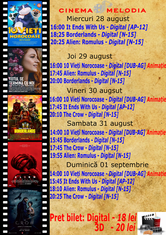În perioada 28 august – 8 septembrie, Cinema „MELODIA” Dorohoi vă așteaptă la film! Vor rula: