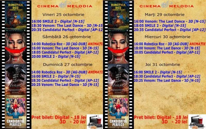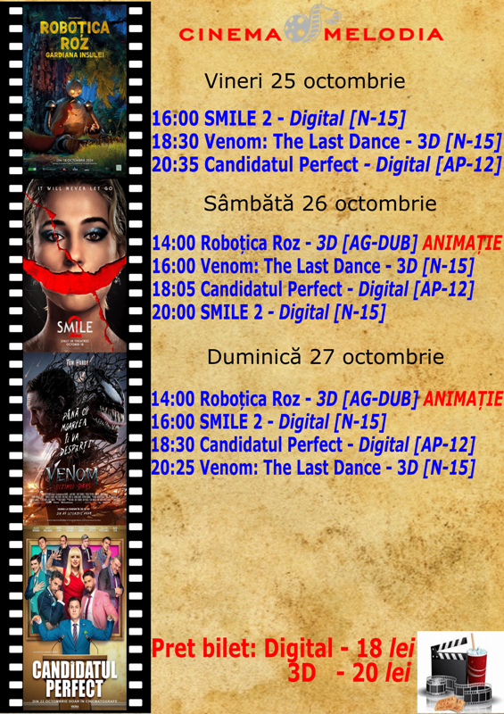 În perioada 25 – 31 octombrie, Cinema „MELODIA” Dorohoi vă așteaptă la film! Vor rula: