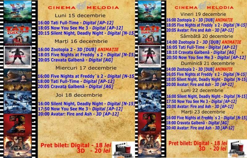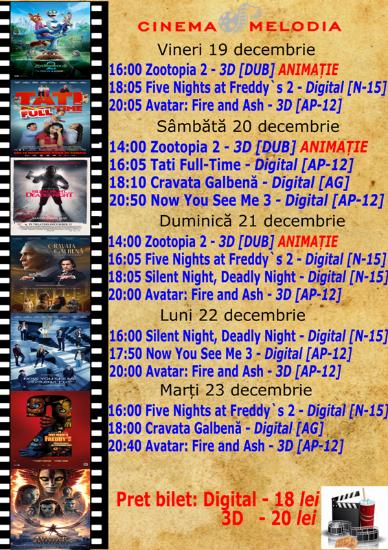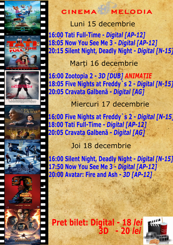 În perioada 15 - 25 decembrie, Cinema „MELODIA” Dorohoi vă așteaptă la film! Vor rula: