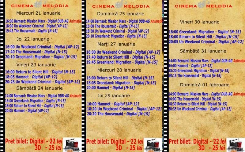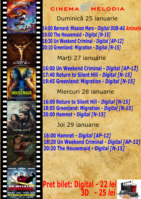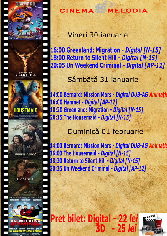 În perioada 21 ianuarie – 1 februarie, Cinema „MELODIA” Dorohoi vă așteaptă la film! Vor rula:
