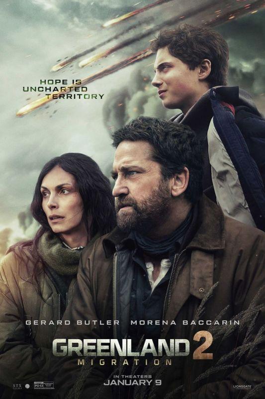 Greenland: Migration - După ce o cometă a lovit Pământul și aproape toată planeta a fost distrusă, „Groenlanda 2: Migrația” continuă povestea familiei Garrity (Gerard Butler, Morena Baccarin, Roman Griffin Davis) care părăsește buncărul din Groenlanda pentru a căuta un cămin ferit de catastrofe. Însă mai întâi trebuie să depășească pericolele unor ținuturi pierdute, dar și fenomene extreme neprevăzute.