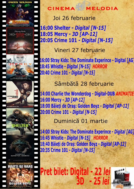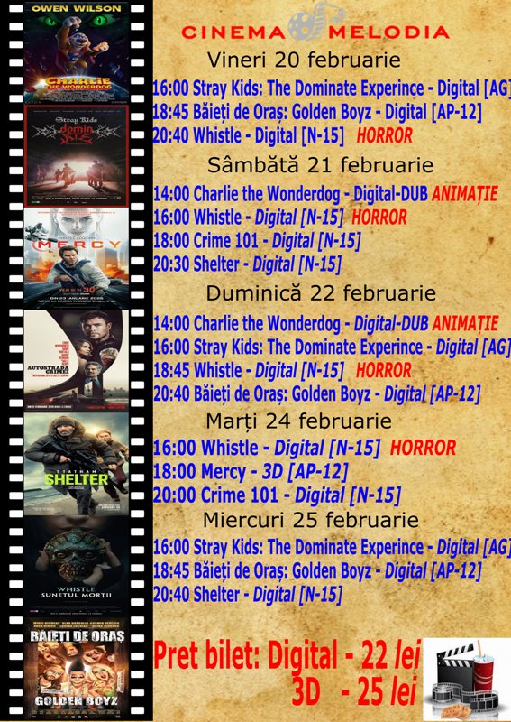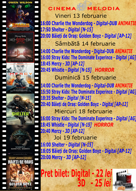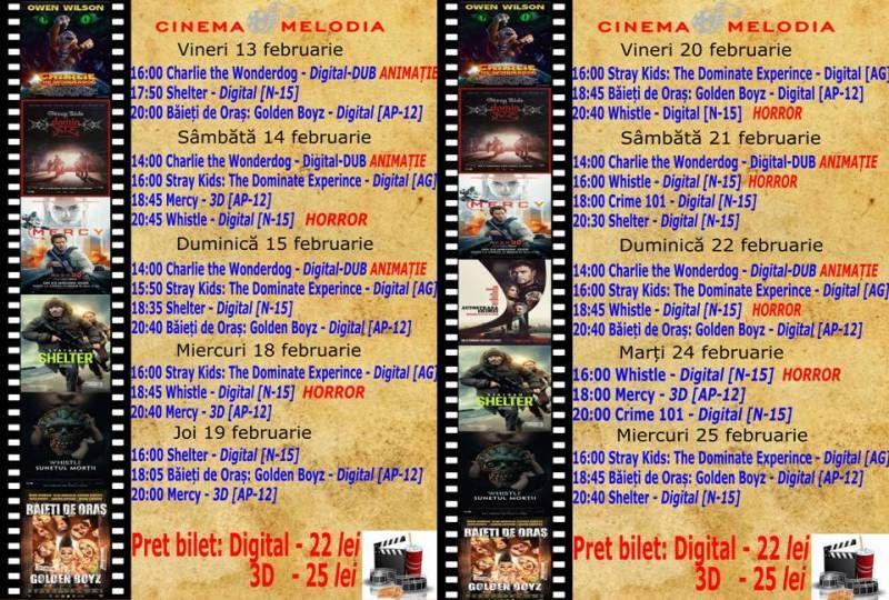 În perioada 13 februarie – 1 martie, Cinema „MELODIA” Dorohoi vă așteaptă la film! Vor rula: