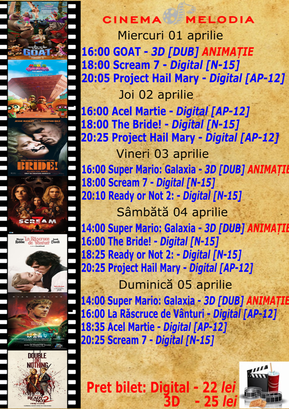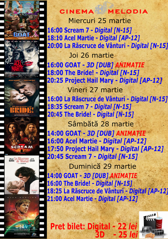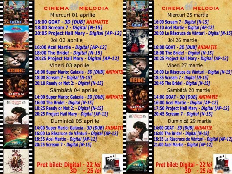 În perioada 25 martie – 5 aprilie, Cinema „MELODIA” Dorohoi vă așteaptă la film! Vor rula: