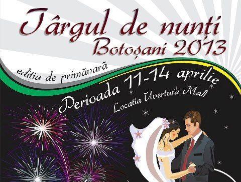 Pro Event Moldova in parteneriat cu Uvertura Mall si Tele M organizeaza in perioada 11-14 aprilie in incinta Uvertura Mall Targul de Nunti Botosani 2013, editia de primavara. Targul de Nunti Botosani 2013 vine in sprijinul firmelor specializate in organizarea de evenimente, dar mai ales a publicului larg.