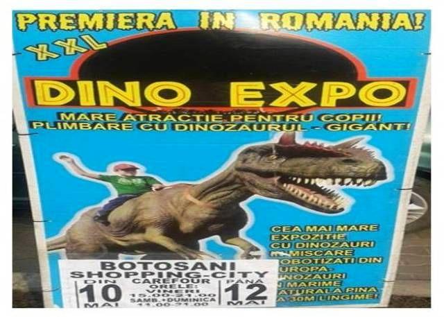 „XXL DINO EXPO”, cea mai mare expoziţie de dinozauri în mărime naturală din Europa ajunge la Botoșani pe 10 mai. Expoziția „XXL Dino Expo” prezintă replici în mărime naturală ale celor mai mari animale de pe planetă confecţionate din materiale speciale, precum latex şi fibră de sticlă.