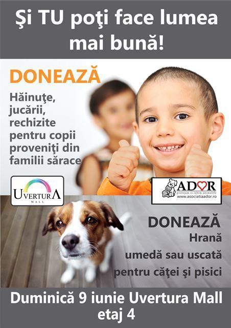 Uvertura Mall, în parteneriat cu Asociația Ador, organizează în week-end-ul 8-9 iunie 2013, o acțiune caritabilă de strângere de hăinuțe, jucării și rechizite, pentru copiii din familiile sărace. De asemenea în cadrul aceleași acțiuni botoșănenii sunt invitați să doneze hrană uscată sau umedă pentru cățeii și pisicile din grija Ador.