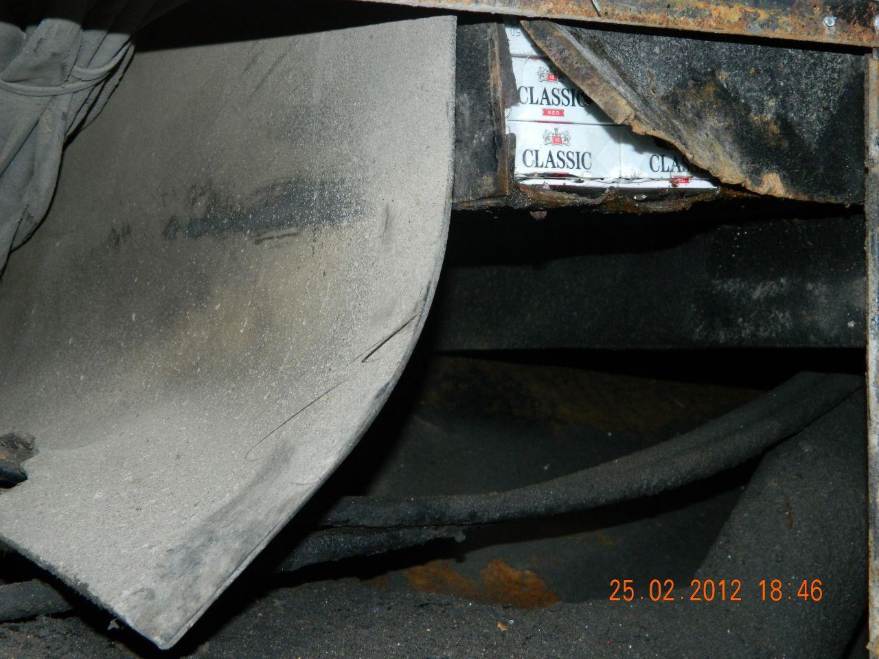 În urma controlului amănunţit efectuat de echipa unică de control, formată din lucrători vamali, poliţişti de frontieră şi şeful PTF Costeşti – R. Moldova, a fost descoperită, ascunsă şi nedeclarată, în vederea sustragerii de la controlul vamal, în locaşuri special amenajate în aripile faţă ale autocarului, cantitatea de 128.600 ţigarete marca Classic, cu timbru de acciză Ucraina, în valoare totală de 56.000 lei.