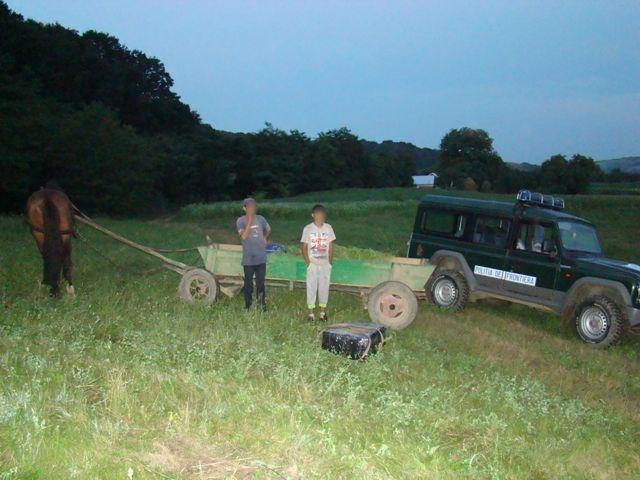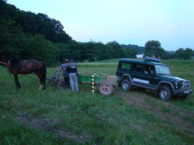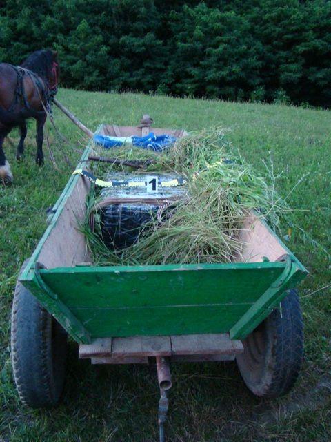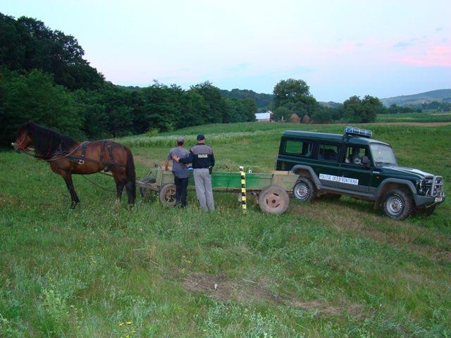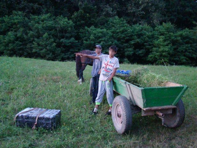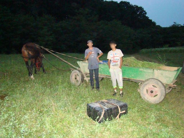 În cadrul acestei acţiuni, în jurul orelor 19:00, lucrătorii noştri au depistat şi reţinut, pe direcţia localităţii de frontieră Hilişeu-Crişan, două persoane care se deplasau cu un atelaj hipo în care se afla un colet voluminos, acoperit cu iarbă.