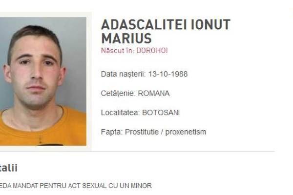 Adascalitei Ionut Marius, născut în Dorohoi, are mandat de arestare emis pe numele său pentru prostitutie / proxenetism, poseda mandat pentru act intim cu un minor.