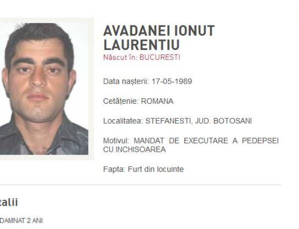 Avadanei Ionut Laurentiu, din localitatea Stefanesti, are mandat de arestare emis pe numele său, condamnat 2 ani, pentru furt din locuinte.