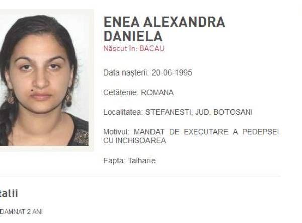 Enea Alexandra Daniela, din localitatea: Stefanesti, are mandat de arestare emis pe numele său, condamnat 2 ani, pentru talharie. Sursa: politiaromana.ro
