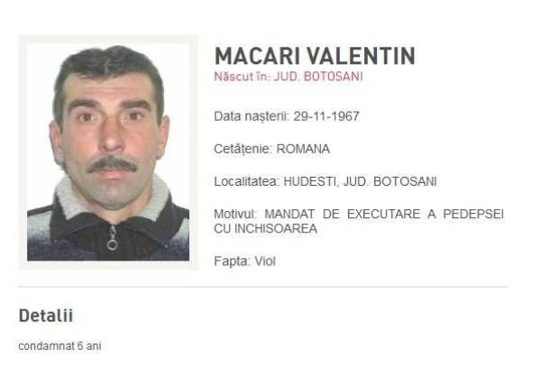 Macari Valentin din comuna Hudesti, are mandat de arestare emis pe numele său, condamnat 6 ani, pentru viol.