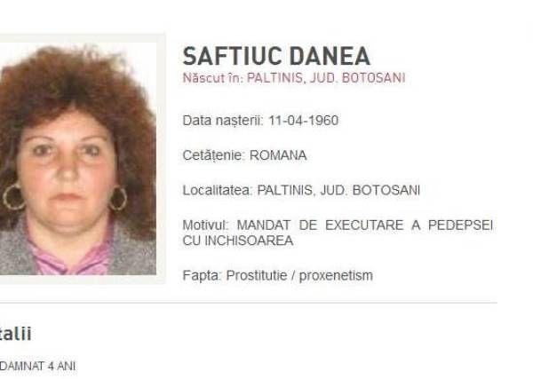 Saftiuc Danea din comuna Paltinis, are mandat de arestare emis pe numele său, condamnată 4 ani, pentru prostitutie / proxenetism.