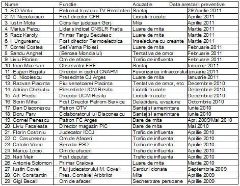 Mai trebuie precizat ca ordinea inserarii numelor este strict cronologica. Cel mai ‚proaspat’ arestat preventiv este Sorin Ovidiu Vintu, care a fost incarcerat pentru 29 de zile la finele saptamanii trecute. (DorohoiNews.ro)