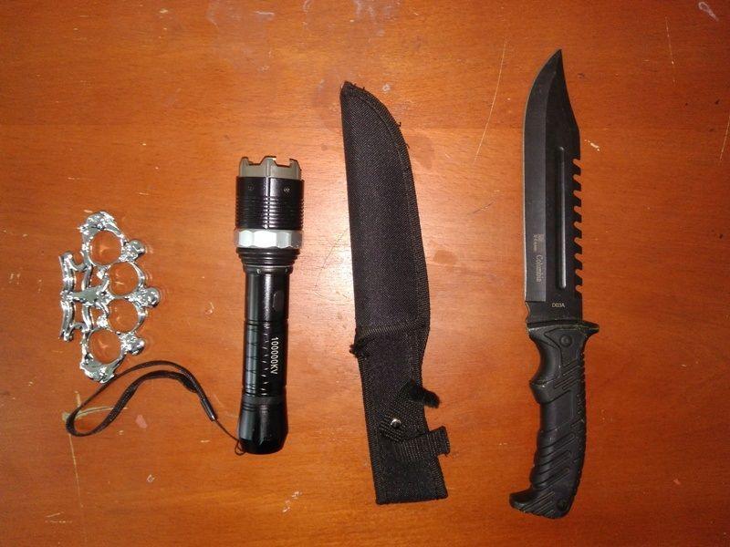 În urma controlului autovehiculului cu care tânărul venise în zonă au fost găsite un cuțit cu lama de aproximativ 19 cm lungime, o lanternă cu eletroșocuri și un box metalic tip rozetă.