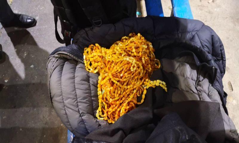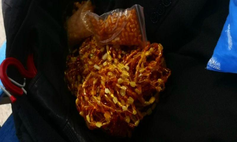 În baza schimbului de informații cu polițiști de frontieră din Republica Moldova, lucrătorii nostri au solicitat inspectorilor vamali efectuarea unui control amănunţit asupra autoturismului şi persoanei. Astfel au fost descoperite, ascunse si nedeclarate, în vederea sustragerii de la controlul vamal, în bagajele personale și pe corpul persoanei, peste 20 de kilograme de șiraguri mărgele de culoare galben-maroniu transparente, susceptibile a fi din chihlimbar.